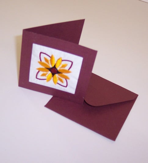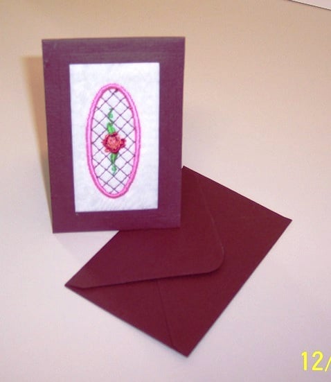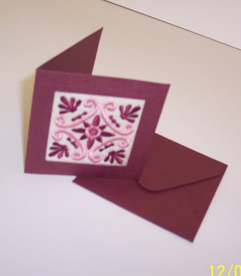 Pack of three Gift Cards in a deep mulberry shade. Each has a different embroidery in the centre. Size of Cards two 8cm x 8cm and one 9cm x 7 cm. This is a set of three but can be bought for £1 each.