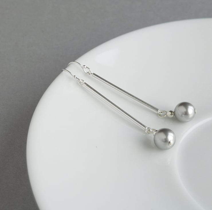 8mm light grey glass pearls hang from Sterling silver drops to create these elegant dangle earrings. Simple in design, these pearl drop earrings will compliment most outfits and make great gifts.