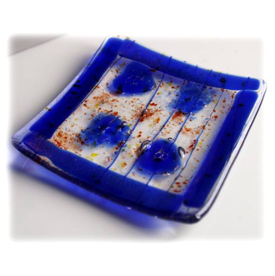 An 11cm square dish, twice fired in my kiln, first to fuse all the glass together, 2nd to slump it over a little mould into a shallow dish shape.