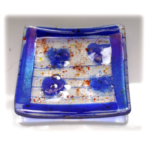 This square dish is on a base of gently collaged clear glass with thin blue lines which is topped with a layer of clear glass and bordered with beautiful rich blue iridescent glass.