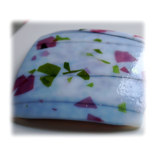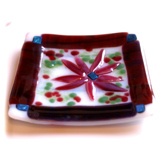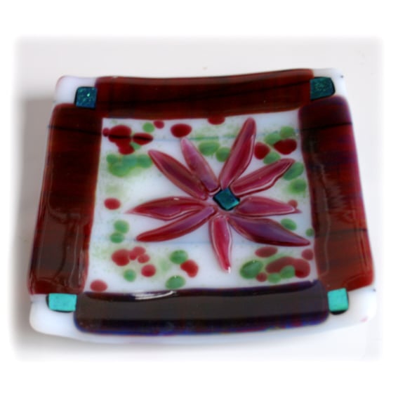 This square dish is on a base of white collaged glass with a pink and green confetti design. I've then added a flower in beautiful plum coloured glass and with a dichroic and very shiny green centre,