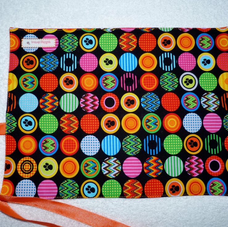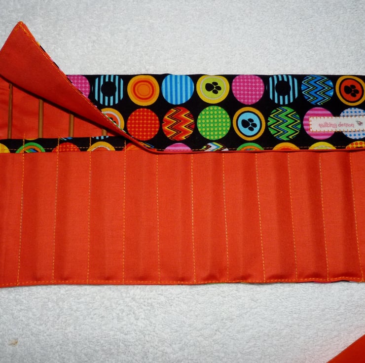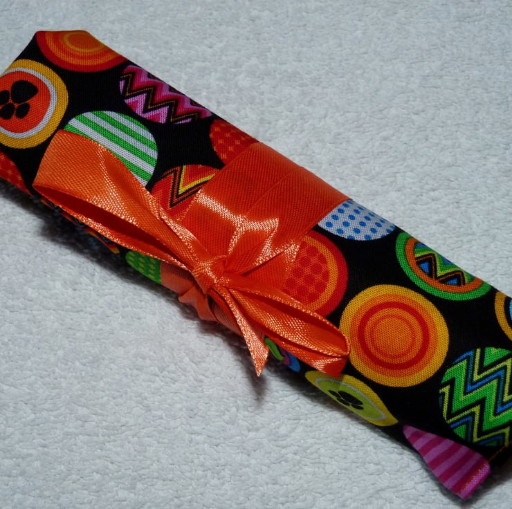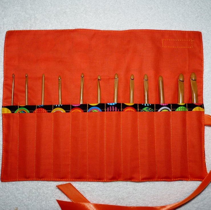 I have used a 100% cotton fabric to create this fantastic crochet hook case. It is sewn from a beautiful print fabric with a plain orange cotton lining and has an orange ribbon tie.