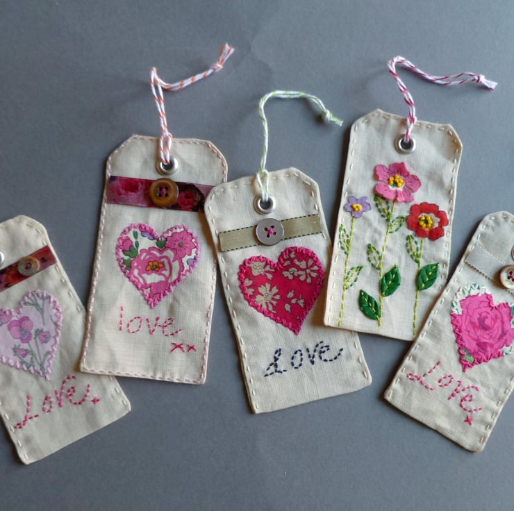 Hand made gift tag with appliqué flowers, leaves and embroidery.
