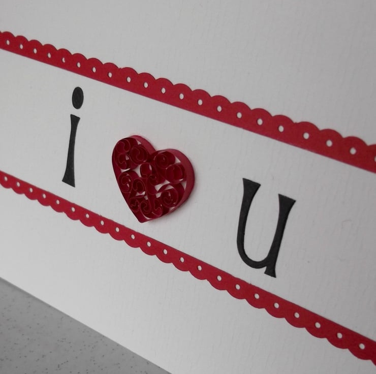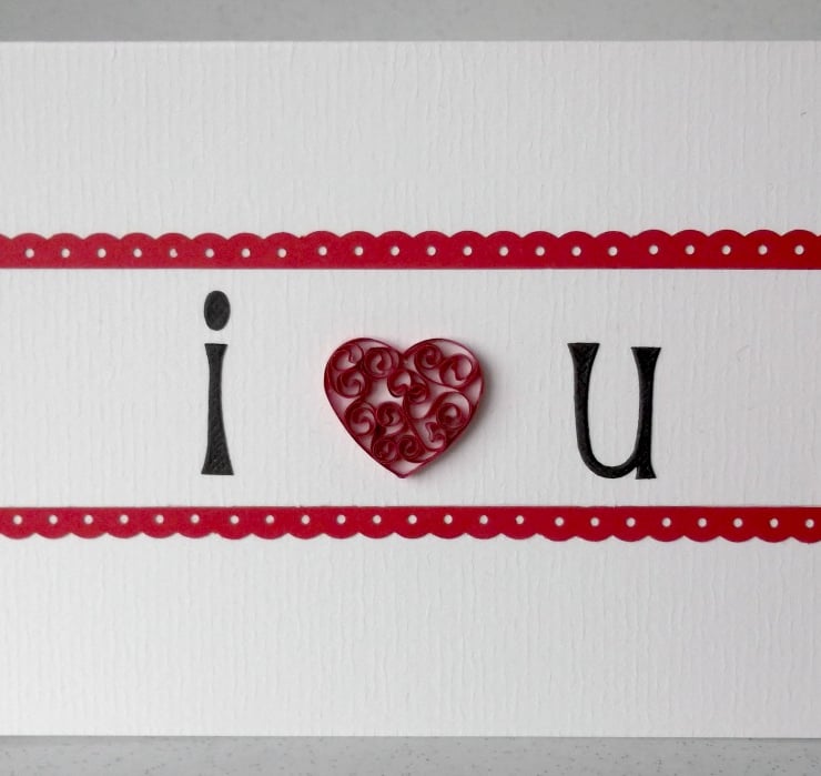 An unusual quilled Valentine card - a paper quilling red heart replacing the word "love", nestling between "i" and "u". Send a special greeting to your loved one.