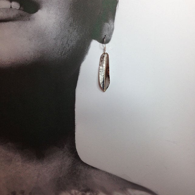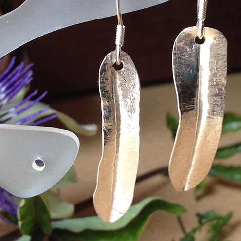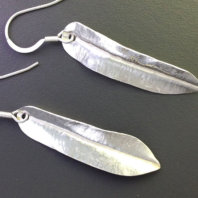 Sterling silver sheet was folded, cut and hammered to foldform the leaf shapes then opened, drilled, filed, and sanded to make the edges smooth.The leaves dangle freely from sterling silver ear wires.