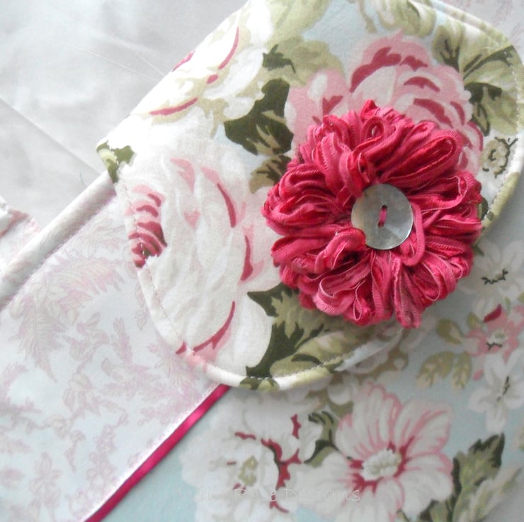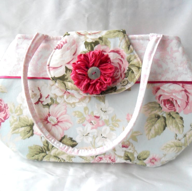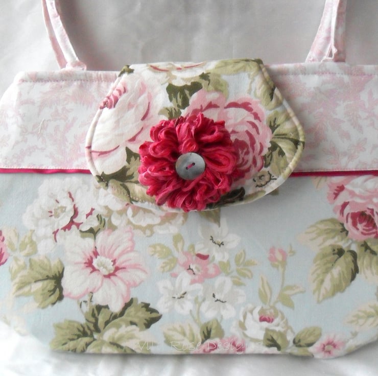 Made using two floral cotton prints, one a pale blue with pink roses and the other has pink foliage on a white background. There is a deep pink ribbon trim between the two fabrics. The handles are in the pink fabric and are long enough to go over the shoulder, while the flap is made in the blue. Inside the lining is a pink floral print cotton and there are two pockets; one zipped and the other for your phone etc. The deep pink looped flower decoration on the flap has a brooch pin on the back and can be removed or re-positioned.