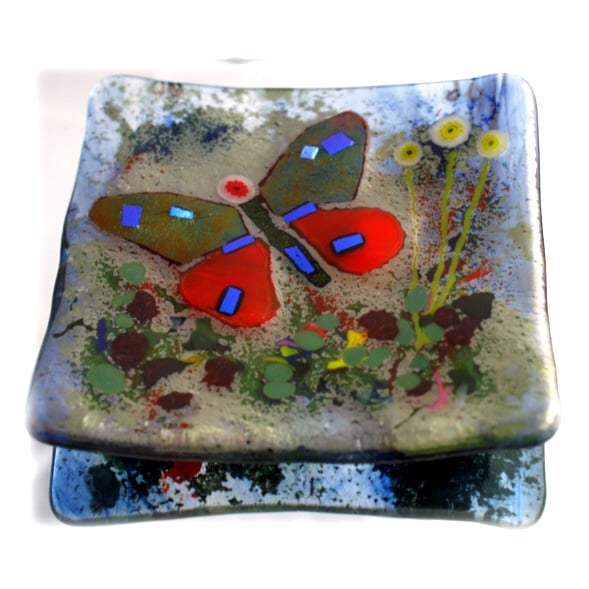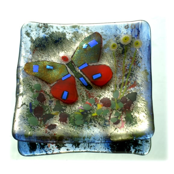 An 11.5 cm square dish, twice fired in my kiln, first to fuse all the glass together, 2nd to slump it over a little mould into a shallow dish shape.