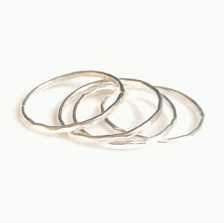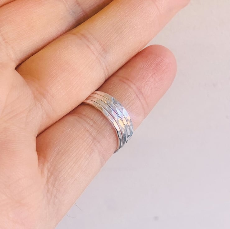 Four textured stacking rings have been hammered textured polished tumbled and polished again for strength and extra sparkle!