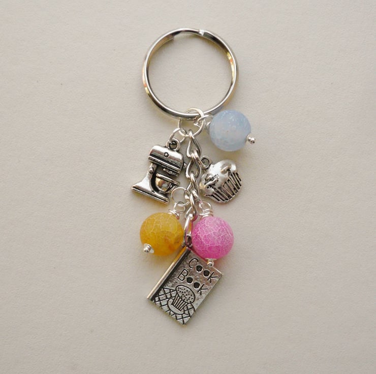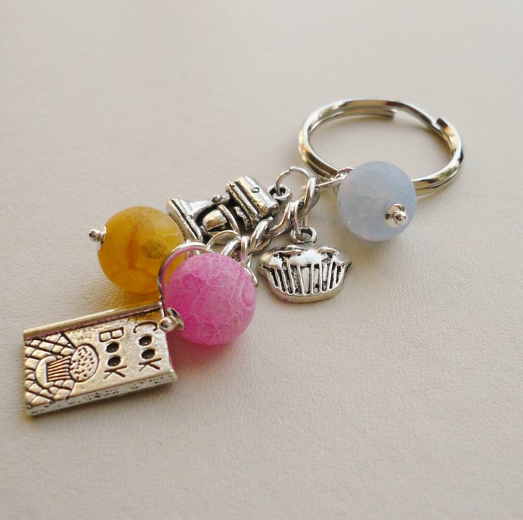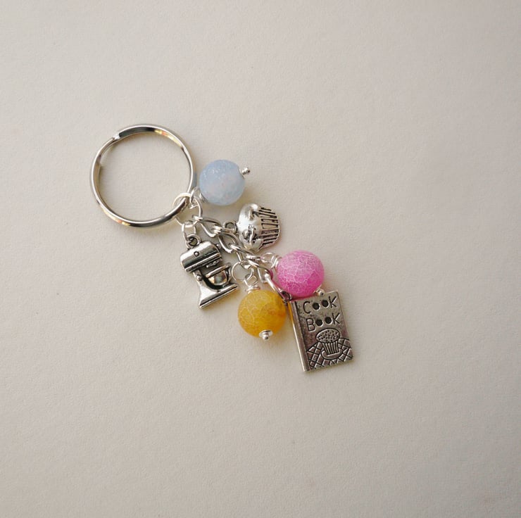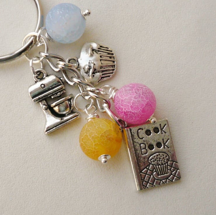 This pretty keyring is made up of three 10mm pastel candy coloured frosted cracked agate beads teamed with three cake making themed Tibetan silver charms - mixer, cupcake and cookbook. All attached to a silver plated 25mm keyring and chain.
