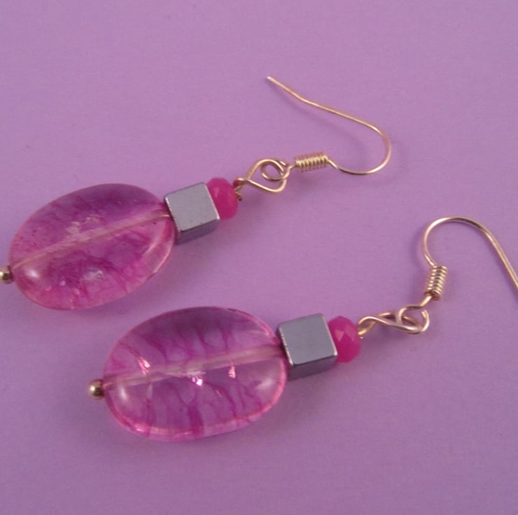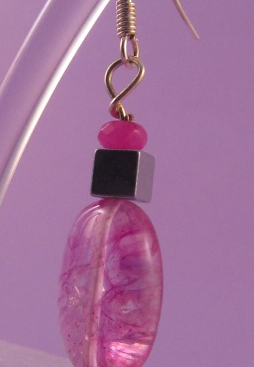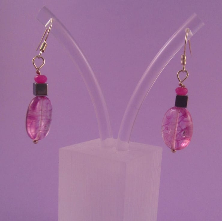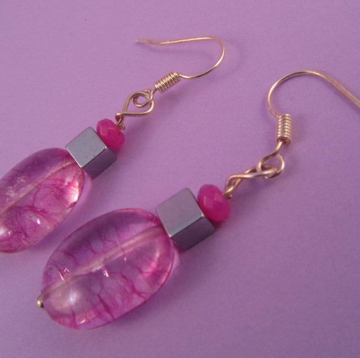 This is a beautiful pair of pink crackled quartz and haematite drop earrings. It is created with real crackled quartz gemstones, real haematite and silver plated copper shepherd hooks. These are great for everyday wear.