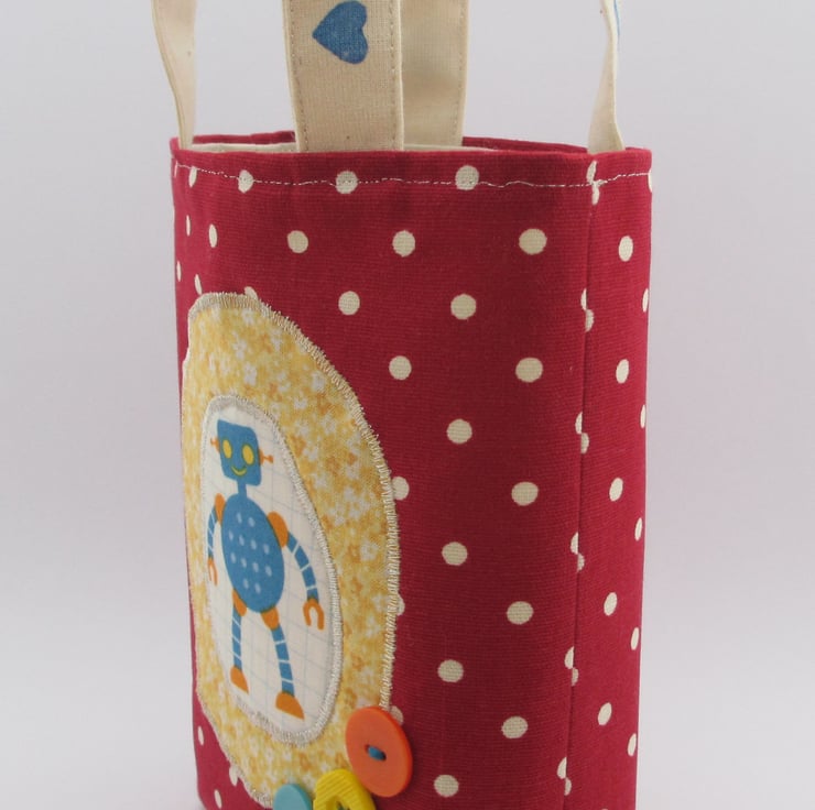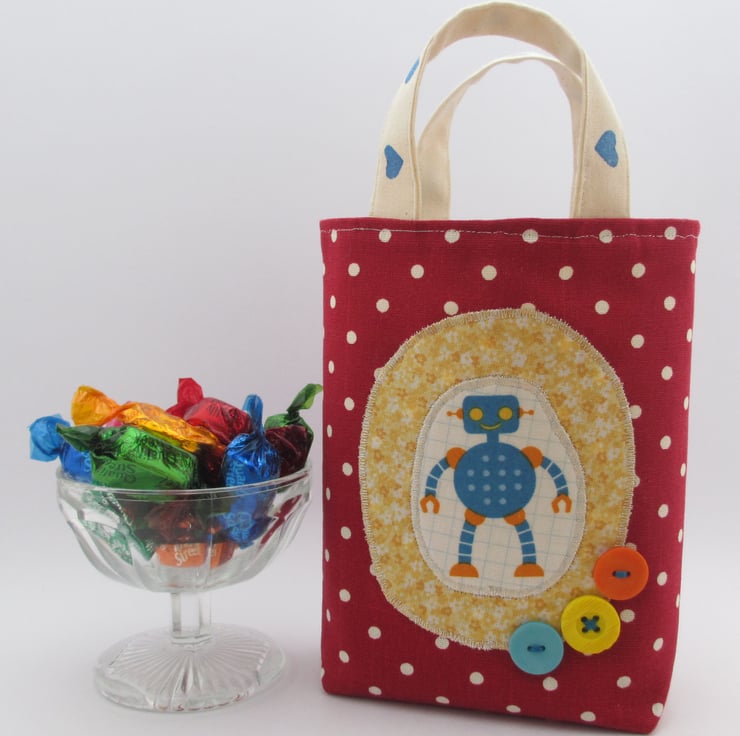 Just the right size for holding little pressies, this bag is unique, handmade and really cute. It's made from a selection of lovely bold printed cotton fabrics, and is adorned with a friendly robot and funky co-ordinating buttons.