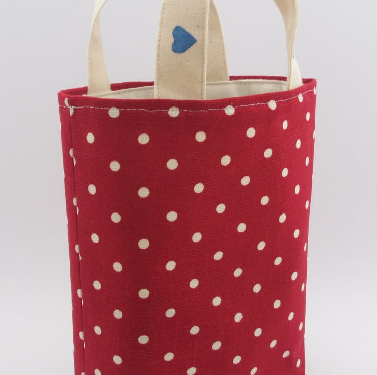 This bag is lined with natural cream calico, and measures approximately 16cm high by 13cm wide when it is sitting naturally. I have designed and made my gift bags to have a flat bottom to accomodate gifts such as littles boxes of yummy biscuits, a watch box or something similar. Fill them with biscuits, sweets, or a fab little pressie of your choice!