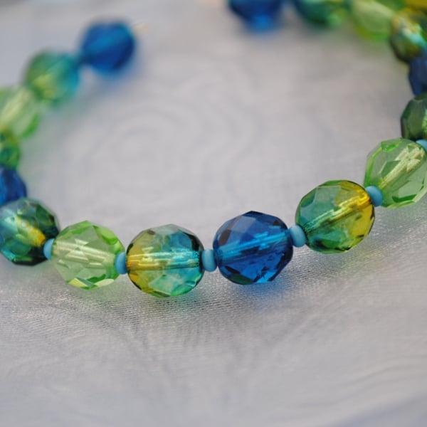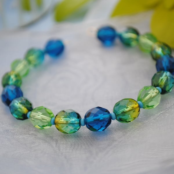 Bangle style bracelet with czech fire-polished beads in capri blue and olive. This bangle bracelet is made with one wrap of silver-plated memory wire and will suit a small wrist (equivalent bracelet size around 7 inches).