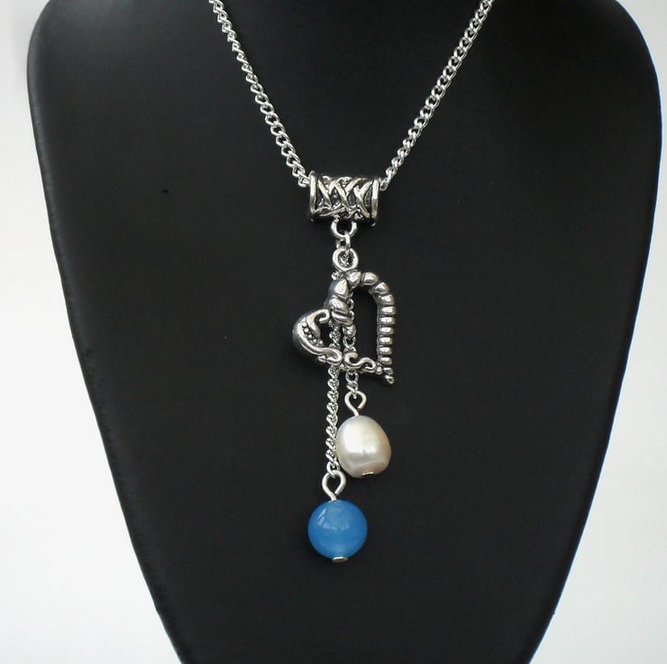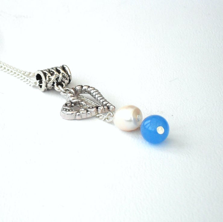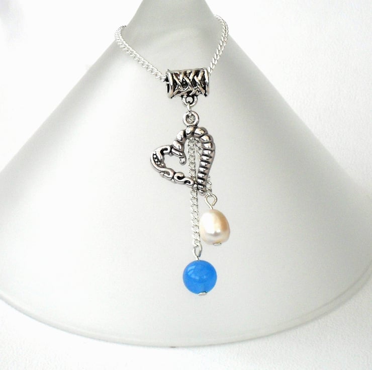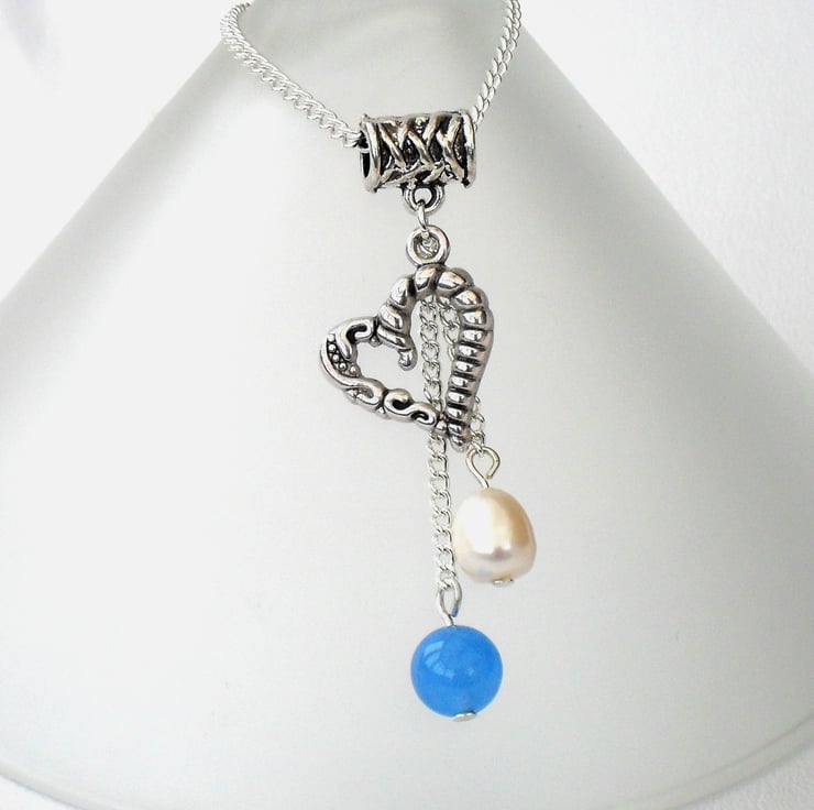 An individual ivory pearl and a blue jade gemstone hang with an ornate tibetan silver heart charm to make this delicate charm cluster necklace.