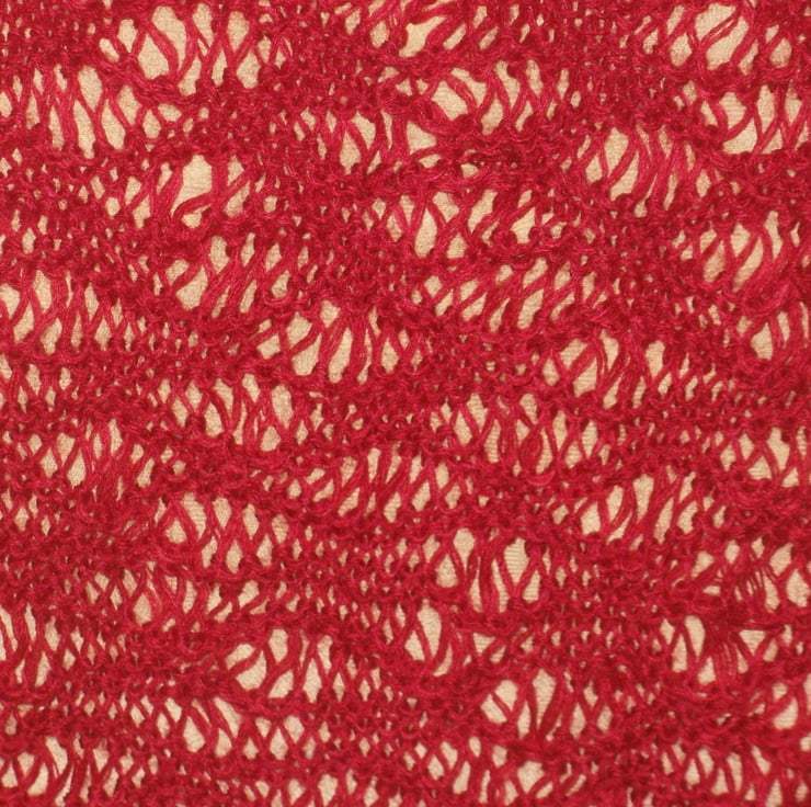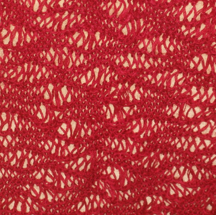 This beautiful lace shawl has been hand knit in two strands of a wine red colour - and weighs nothing! It measures 48 inches at its widest point and 32 inches at its longest.