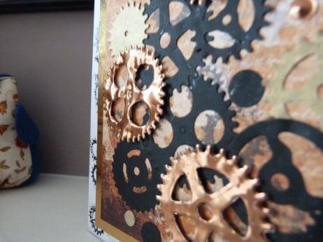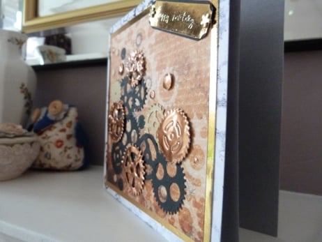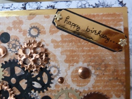 An assortment of cogs, wheels etc cut and embossed from copper metal, black card and gold card all mounted onto cog design paper which has had extra cogs stamped in black onto it. Mounted onto gold card and then onto quality white card which has had the edges stamped with the cog design. Finished off with a happy birthday banner with two gold brads.