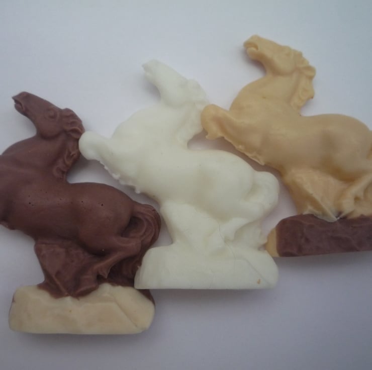 delightful horse shaped soaps, 3 soaps supplied, 1 with a chocolate fragrance, 1 with blackcurrant fragrance, and 1 with a rhubarb & custard fragrance.