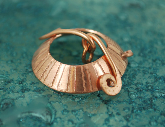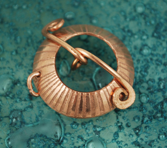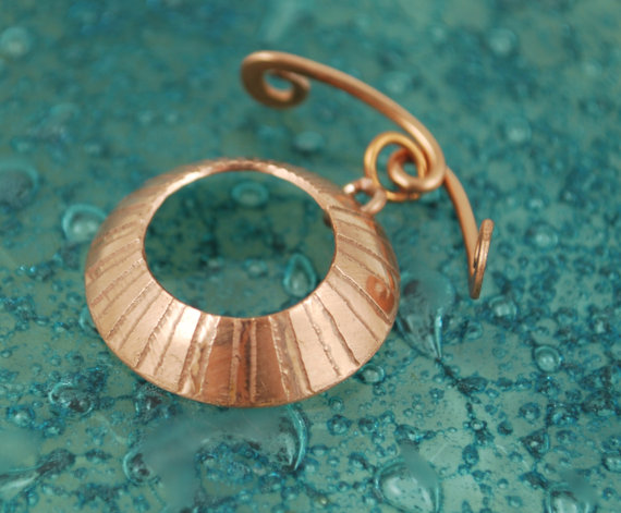 This copper toggle clasp has been completely handmade and etched with an effected Japanese sunburst pattern design. A circle is cut to accommodate the toggle, which has been forged from 1.5mm / 15 gauge copper wire. The shape of the toggle is created by hammering, pinching and manipulating the wire with pliers, then hammered to flatten and curve formed in a cupola die: The clasp is formed from .7mm / 21 gauge sheet copper and is formed with a cupola and die to give it its wonderful curved shape. The underside is finished to a mirror polish and bears no pattern. Attached with 1mm / 18 gauge jump rings.