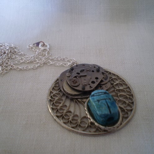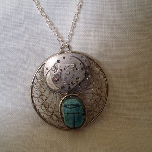 Here is a Steampunk necklace.... Egyptian Revival Style. A vintage watch movement is combined with a lovely ornate filigree silver tone base with a faux turquoise scarab, complete with hieroglyphics. Hangs from a 18 inch silver plated chain. an unusual necklace.... one of a kind.