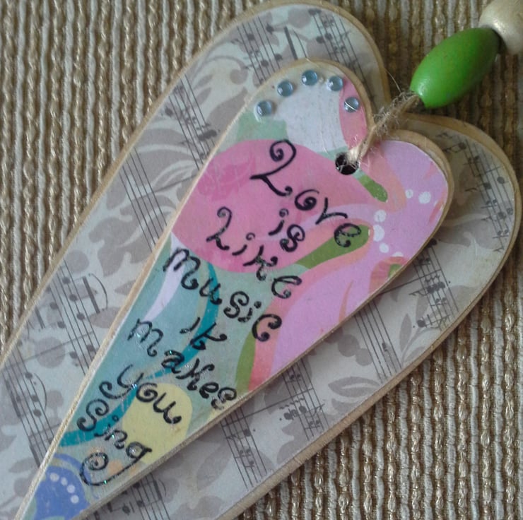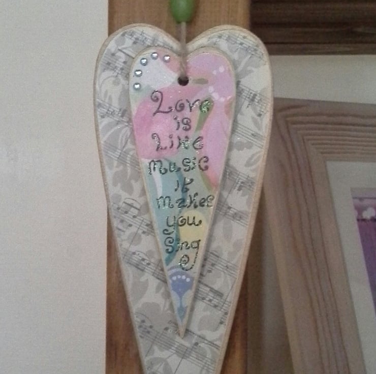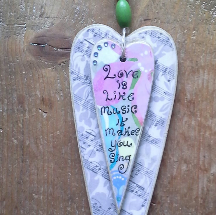 There are two wooden hearts decorated with pretty patterned paper and diamates, the smaller heart in the center has a delightful little phrase 'Love is like music it makes you sing'
