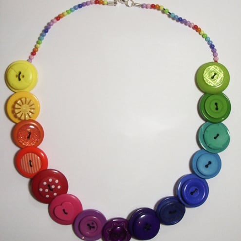 This distinctive button necklace is rich with an assortment of buttons all the colours of the rainbow.