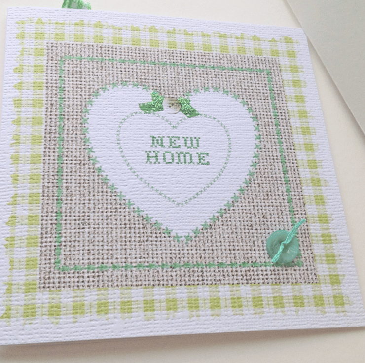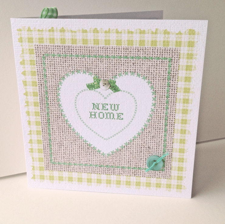 The listing is for a digitally designed New Home Greeting Card, which Is part of my new range for 2014 which I'm calling 'Sweet Stitching' range, inspired by my love of gingham,checked print and all needlework.