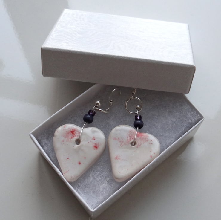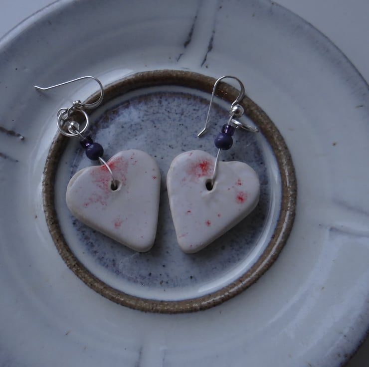 Pretty earrings with hearts handcut from white studio clay, fired twice to 1100 degrees C. The facing side is covered in an unusual glaze that develops cerise spots during firing. Two purple beads to create a lovely contrast. Silver-plated earwires. Light yet strong.