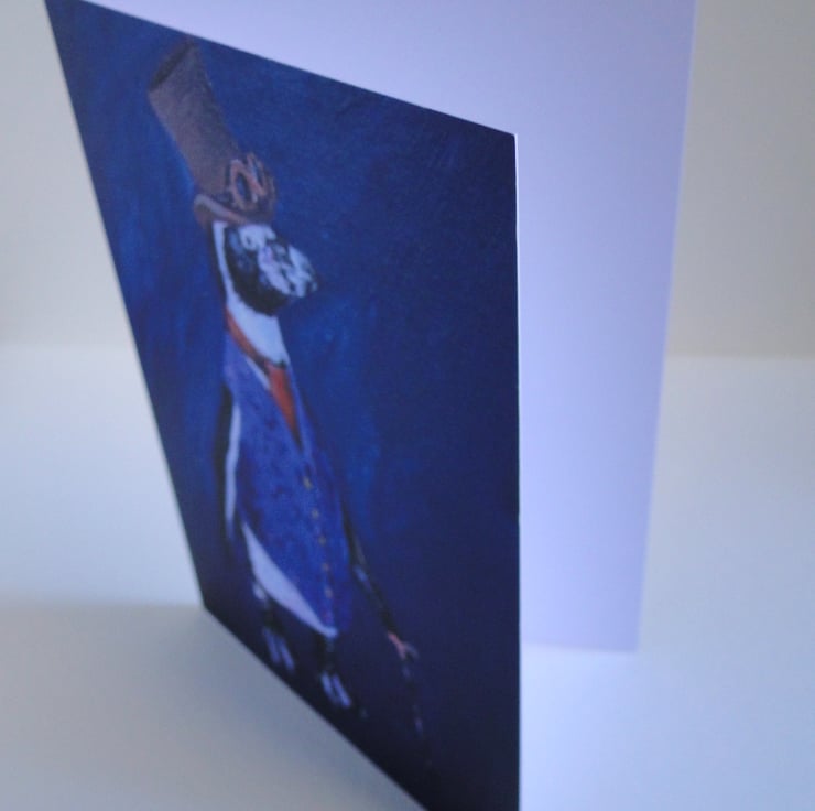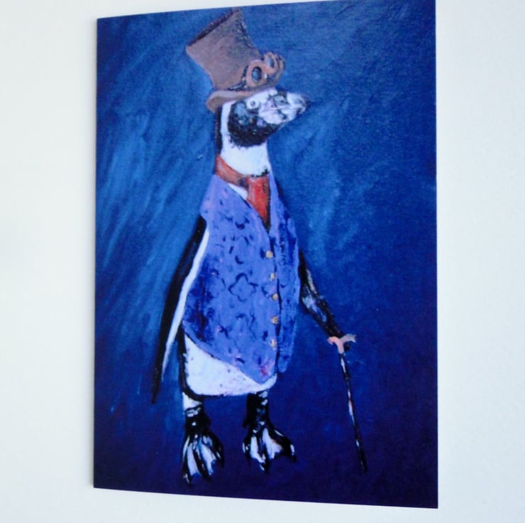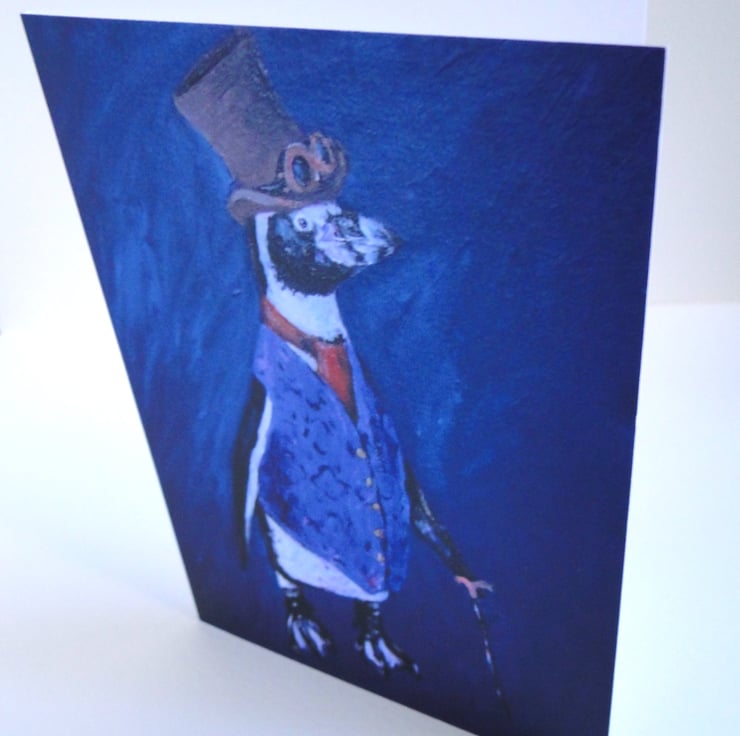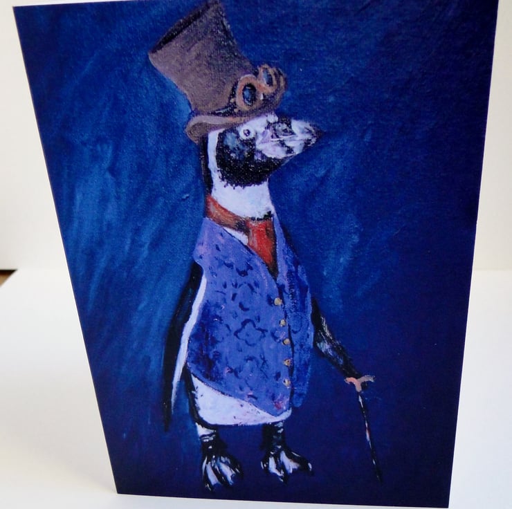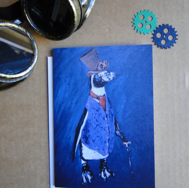 Blank retro greeting card from my original animal acrylic painting Steampunk Penguin