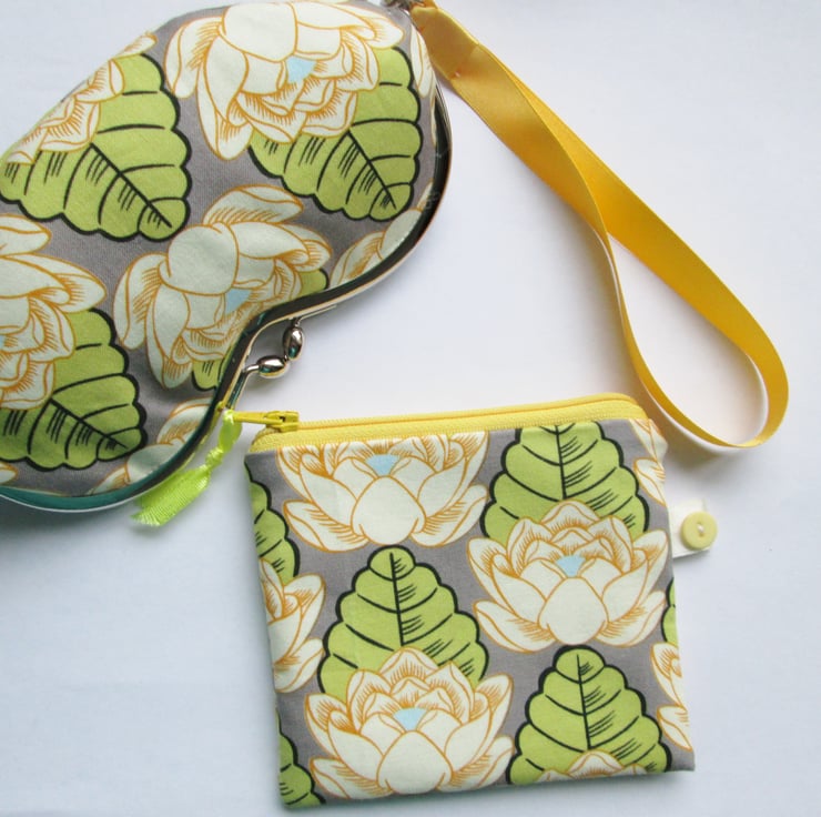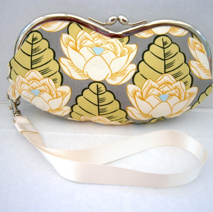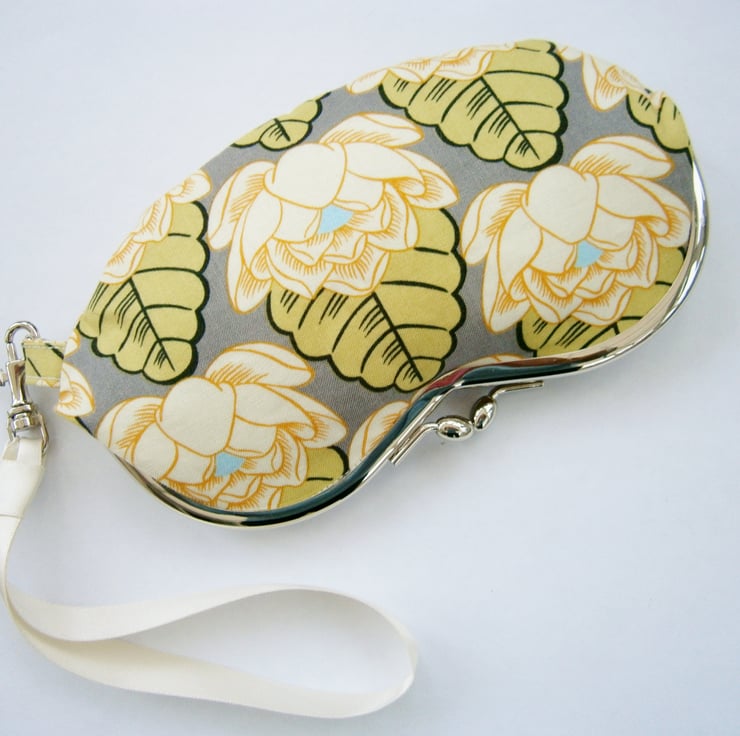 Charming little wristlet purse for sunglasses or mobile phone in pretty Amy Butler Lotus flower fabric with contrasting lining and removable cream or patterned wrist strap. Measures approx 7x3.5