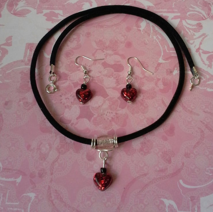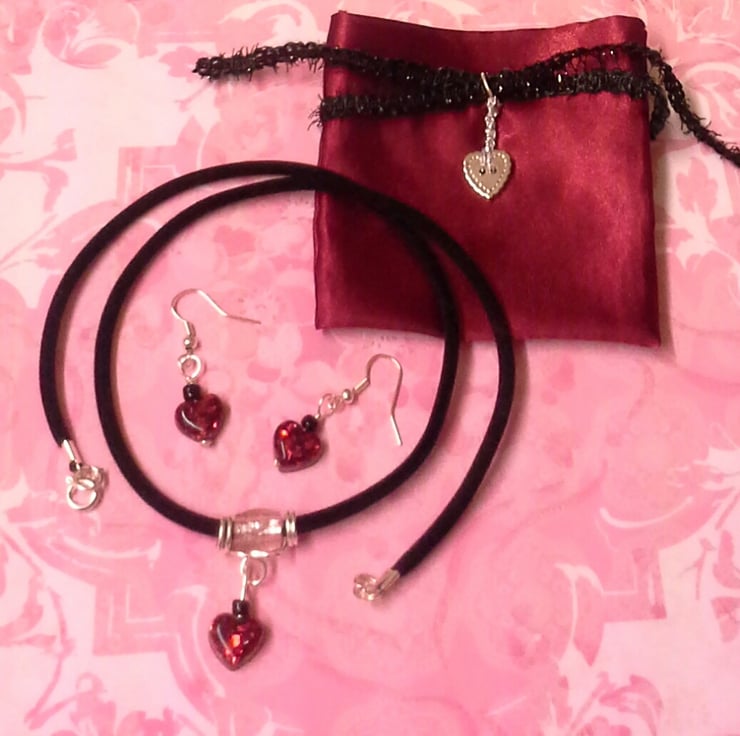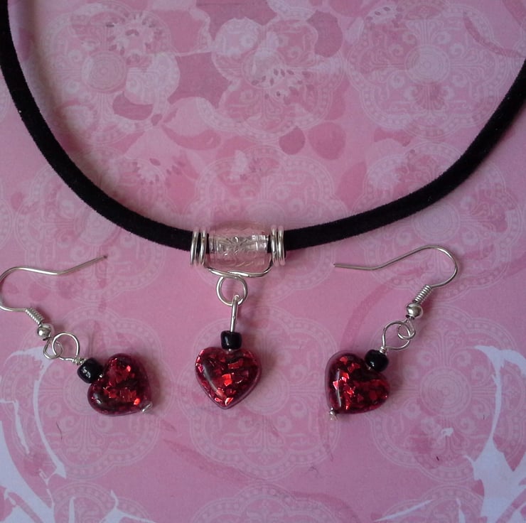 This pretty little necklace and earring set has been made with three sparkling red resin hearts. I have made the hearts using Crystal Clear Resin and coloured them by sprinkling red glitter into the resin.