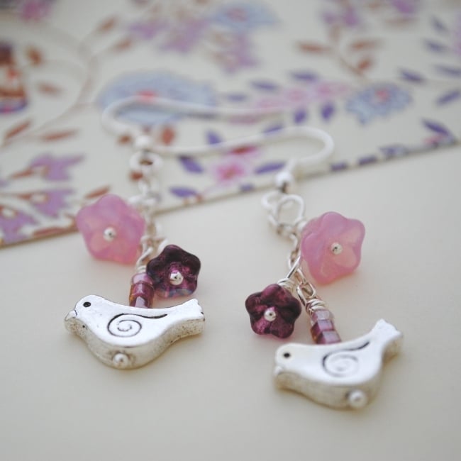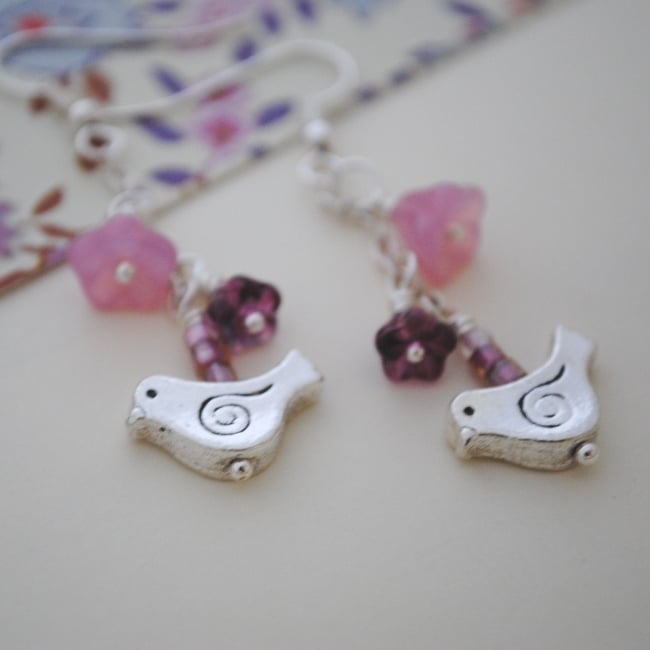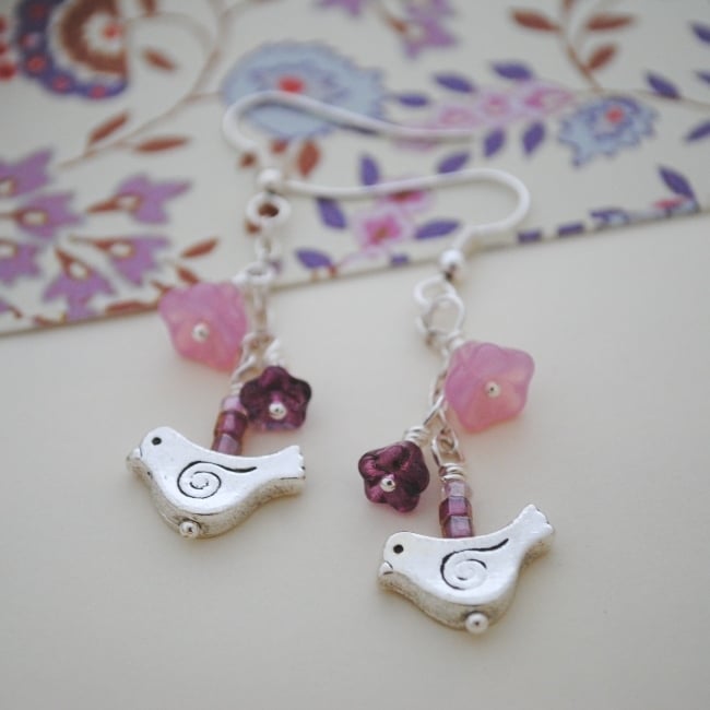 Silver plated earrings with silver bird beads, pimk flowers and pink beads. All hand-wrapped and hanging from a short piece of silver plated chain.