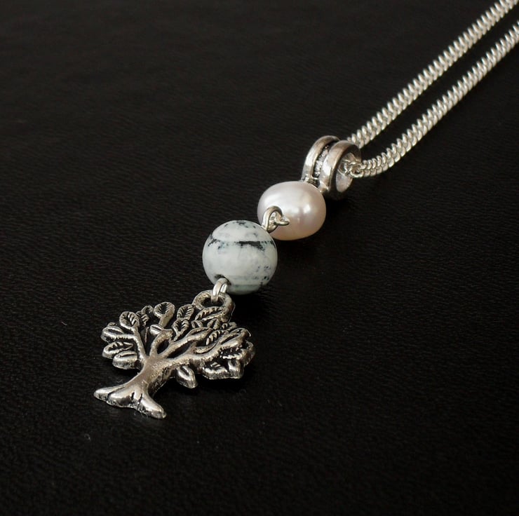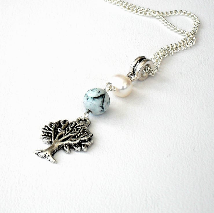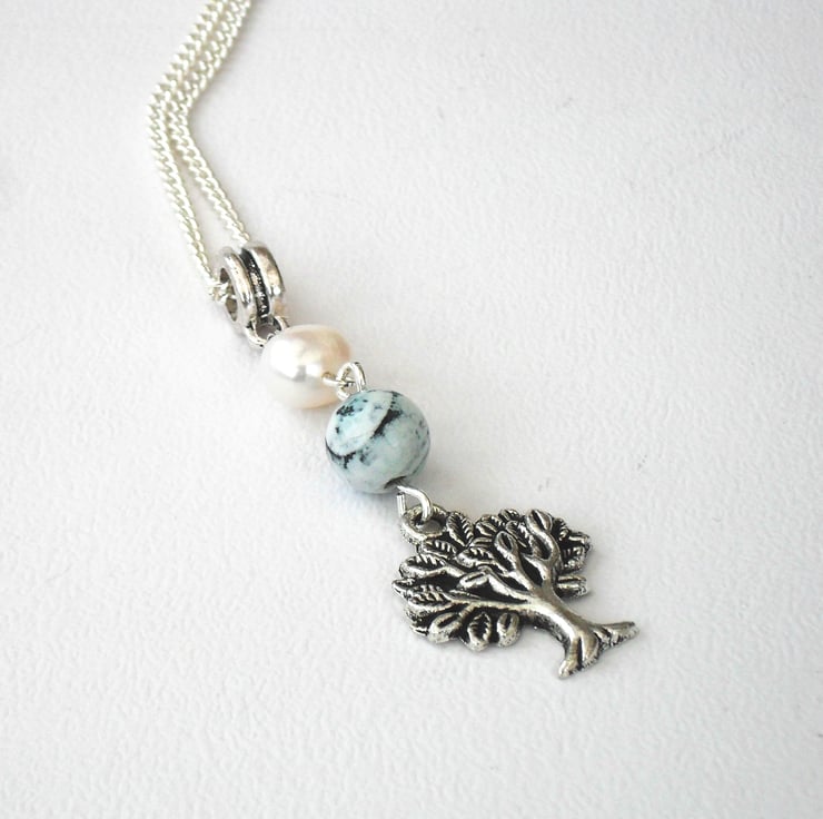 This unique tree charm necklace has been individually designed and created using a green fire agate & white pearl.