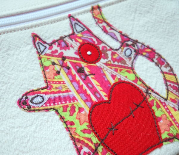 the purse itself is made from heavy weight calico which has been pre-washed several times so it’s soft and should not shrink when washed. it is stiffened with vilene, lined with orange cotton and has a zip fastening.