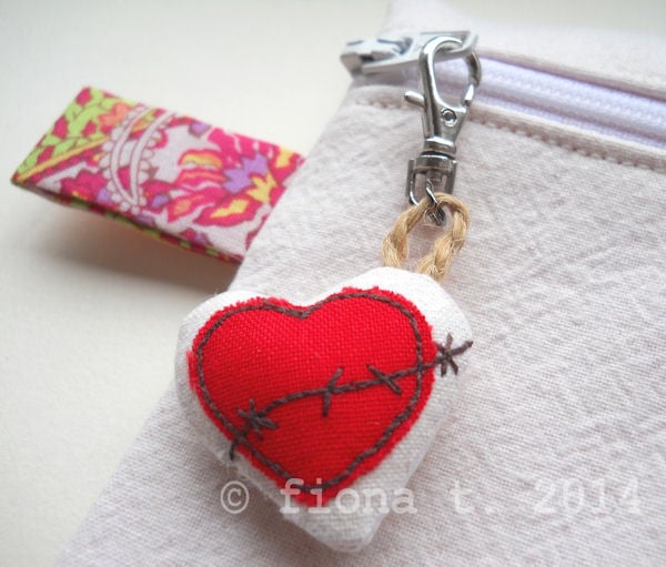 a tiny stuffed zombie heart charm is attached to the zip pull.