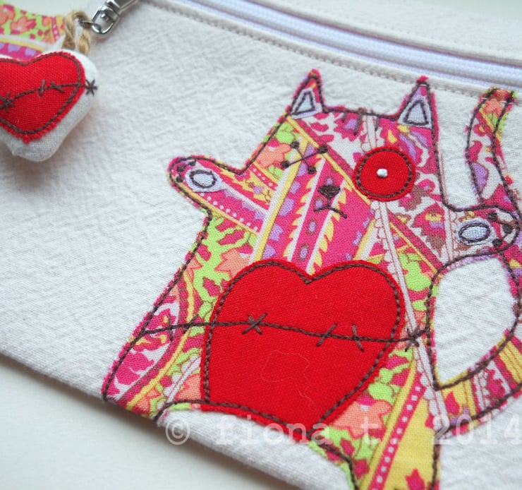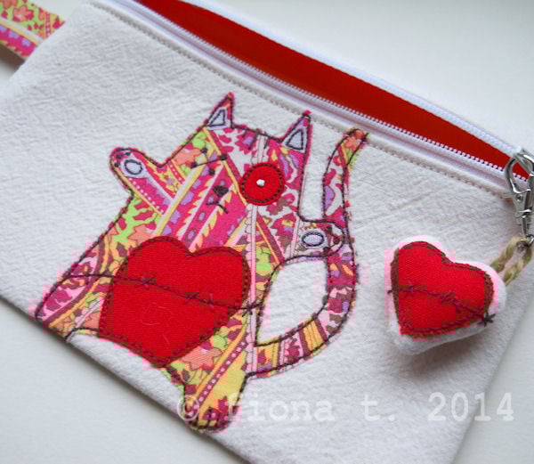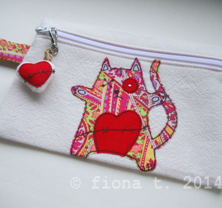 this little cat is in a paisley print cotton fabric, with pale blue linen detail to his ear & paws and a bright red heart on his tummy.