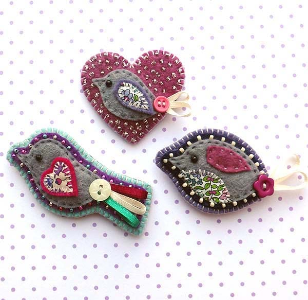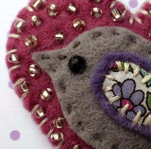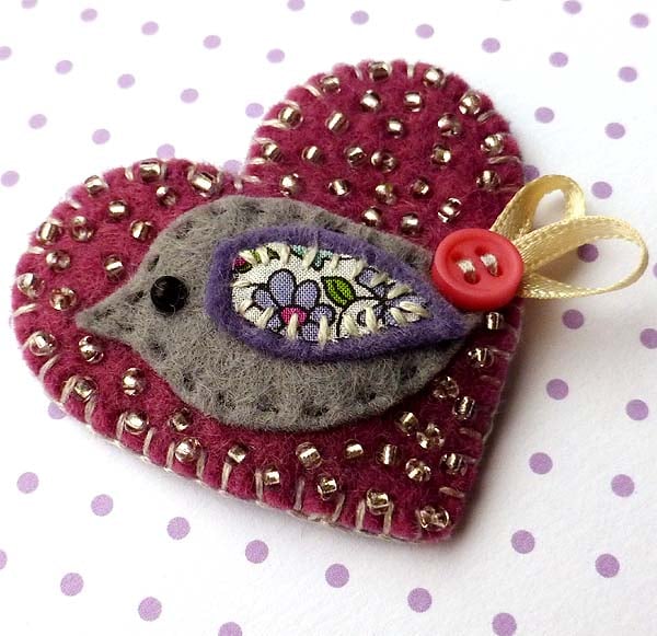 It features a little felt bird with applique wing in lovely Liberty of London fabric. It is stitched onto a pink felt heart shaped base which is adorned with silver coloured seed beads. The bird is finished with a button and ribbon tail and has a metal brooch pin on the reverse side for easy attachment.