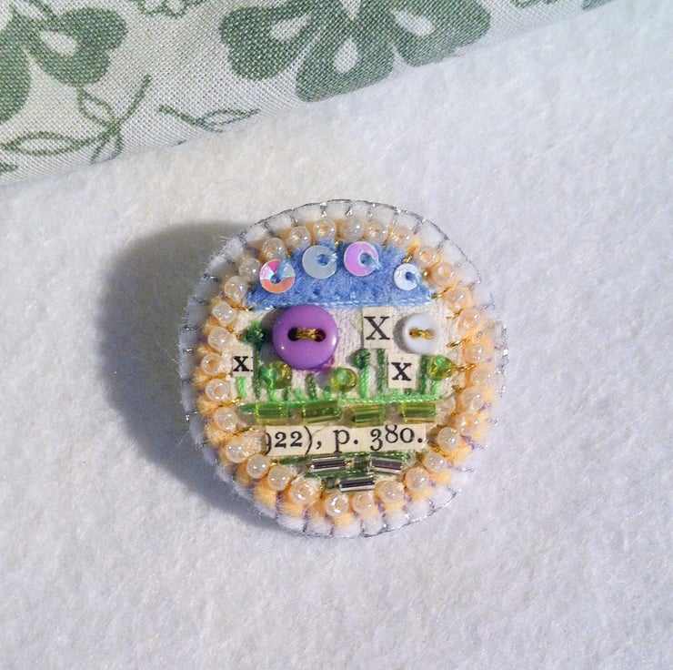 This tiny circle brooch is full of button garden love and hand sewn sparkle. Made from white felt layered with fabric and paper kisses detail then sewn with a mix of beads and micro buttons-super tiny! Edged in opaque seed beads and finished in metallic blanket stitch. The brooch back is sewn to the brooch and covered with a section of white felt.