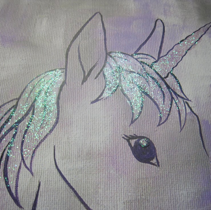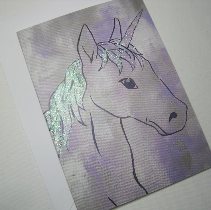 This is a blank greetings card, professionally printed, using a photograph of one of my original paintings of a unicorn, and embellished with pearly glitter.