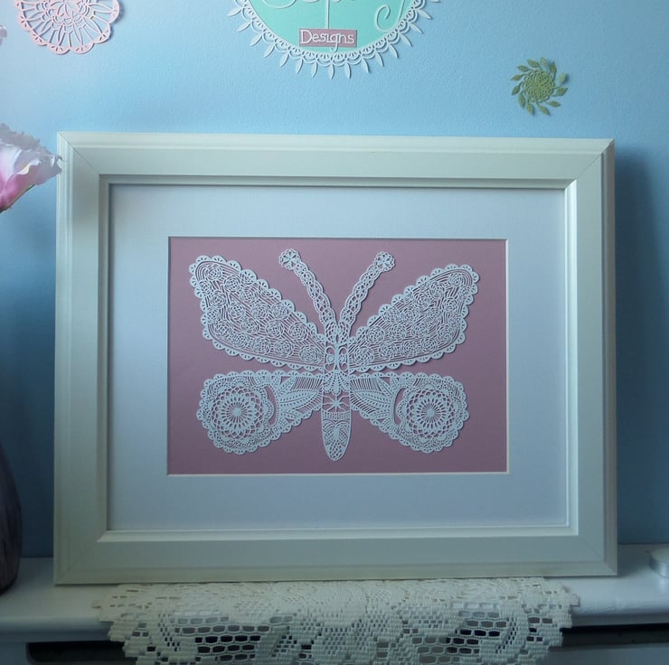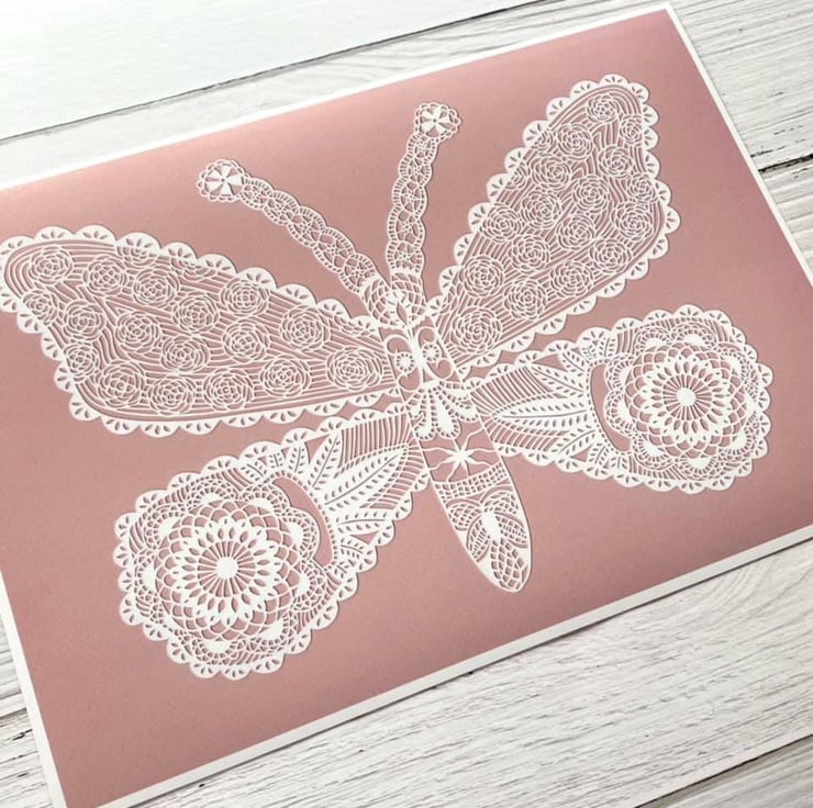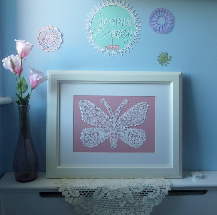 This is an A4 fine art print of the original Lacy Butterfly Papercut which was hand drawn and hand cut by Gemma Esprey.