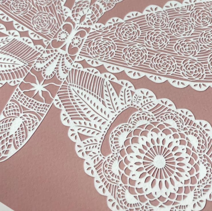 The idea for this piece came to me whilst I was at the ballet. It was in the interval and I was sat with my sketchbook doodling doilies and I thought it would make such a lovely idea to put a circular doily pattern into the wing of a butterfly (as you do!). I did a lot of research on lace later on until I had the most complicated, intricate design I had (at that point) attempted to turn into a papercut. This was a big job, about 40 hours of fiddly, hold-your-breath type cutting and it remains my firm favourite. I have the original hanging in my house.