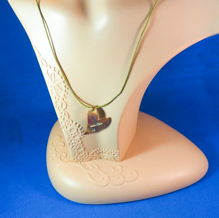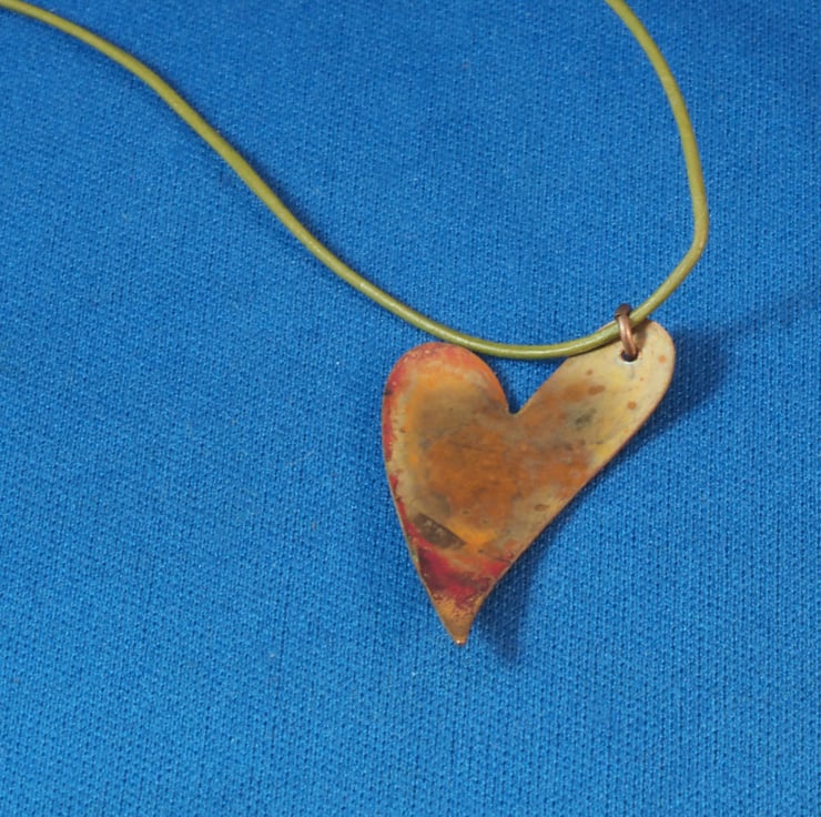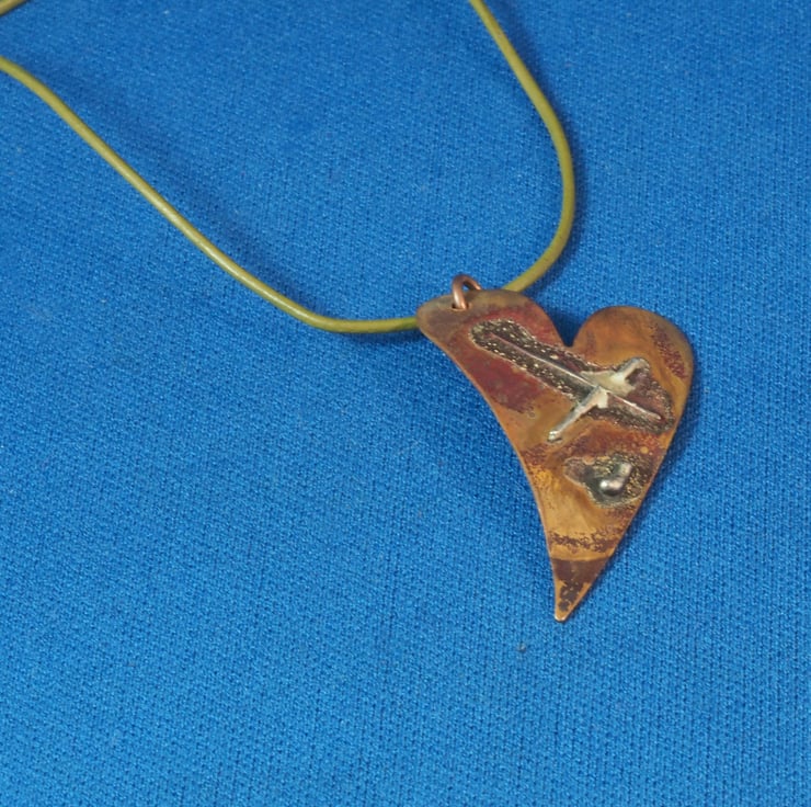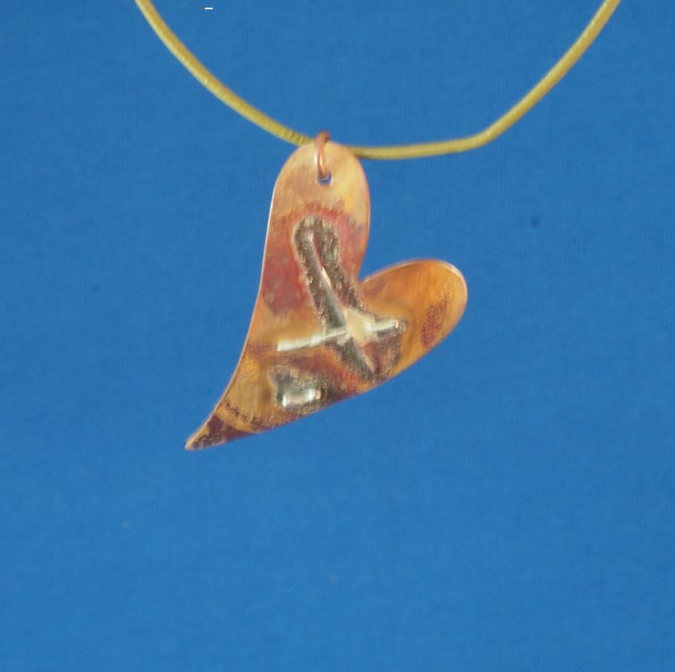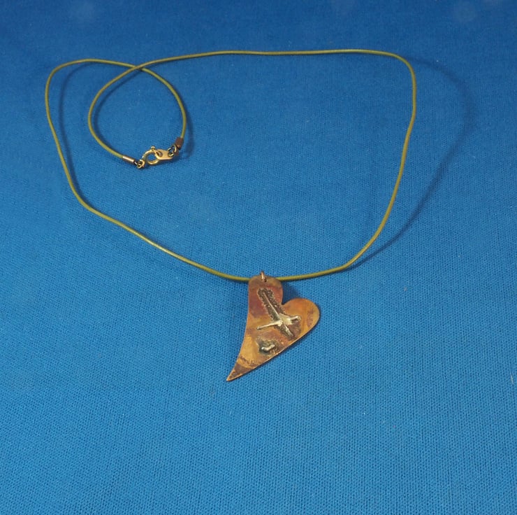 A small heart shaped pendant made of brass, with a fused silver decoration in the form of an x with a random dot below. Unusual and unique, the pendant hangs from very fine, green leather thong fastened with a gilt bolt ring. A hand made copper wire ring supports the pendant on the thonging.