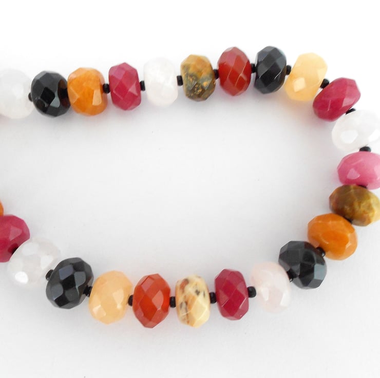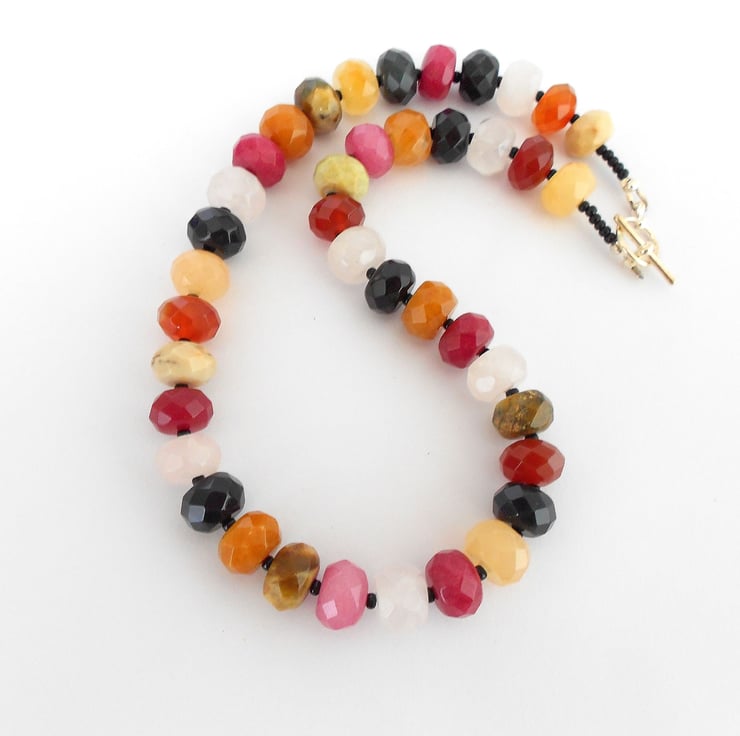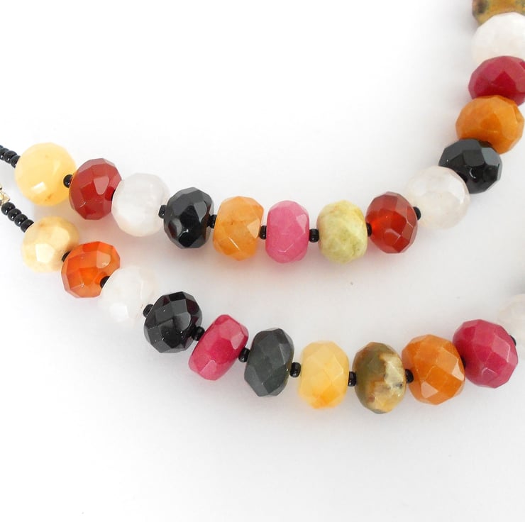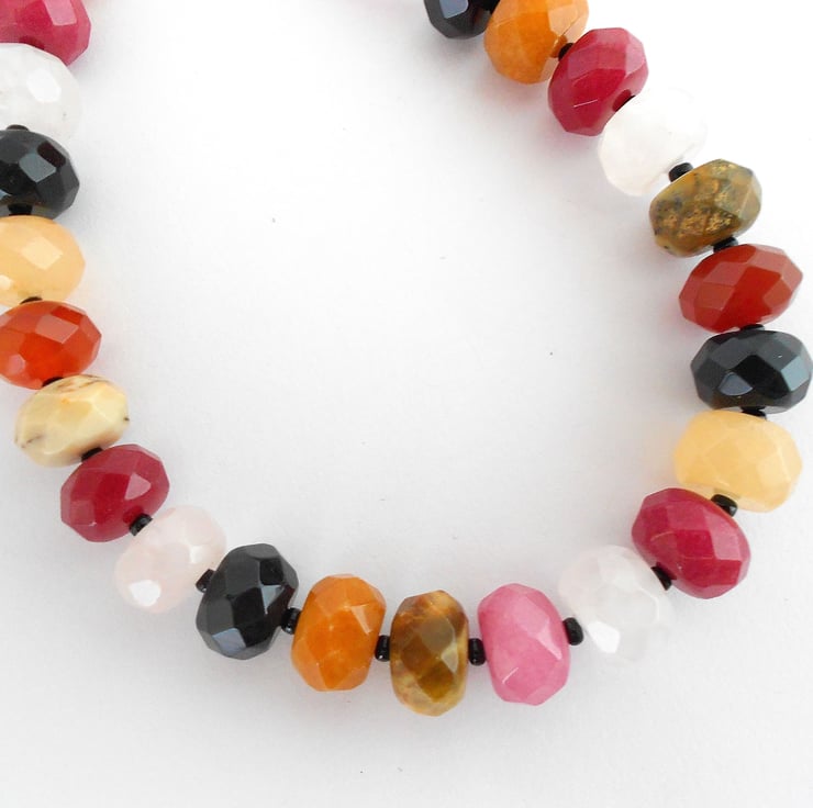 This is a truly lovely necklace of vibrant coloured mixed gemstone rondells. The facets really make these stones sparkle. The beads are each 10mm wide and are interspersed with tiny black glass seed beads. These beads are really top quality and it shows. The necklace measures 44cm (just over 17") long and is finished with a silver plated toggle clasp.