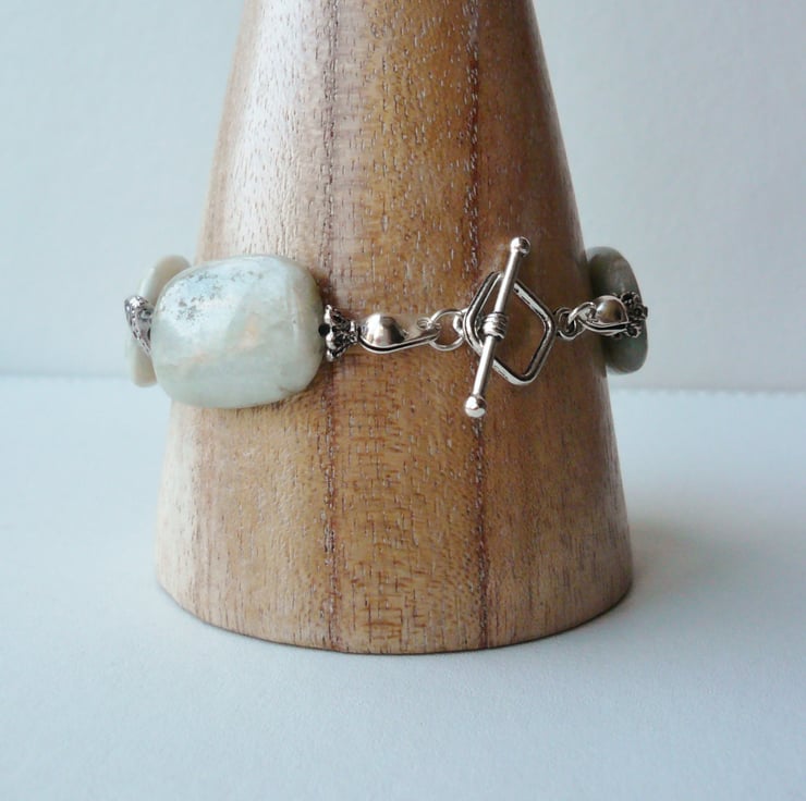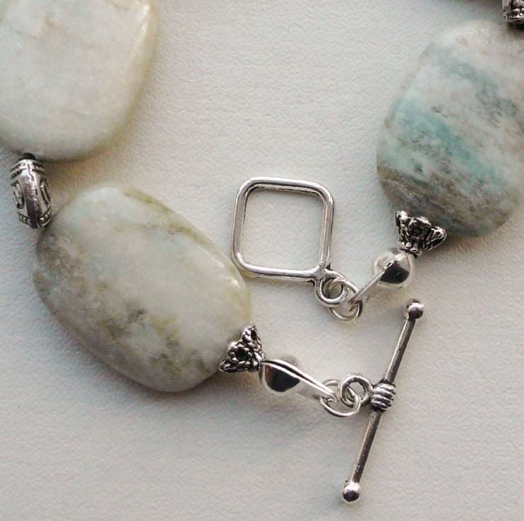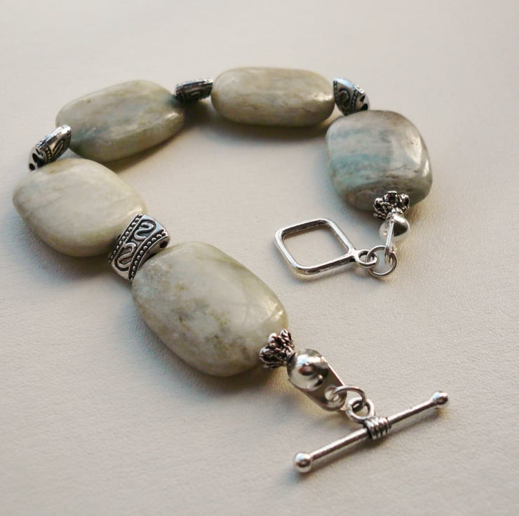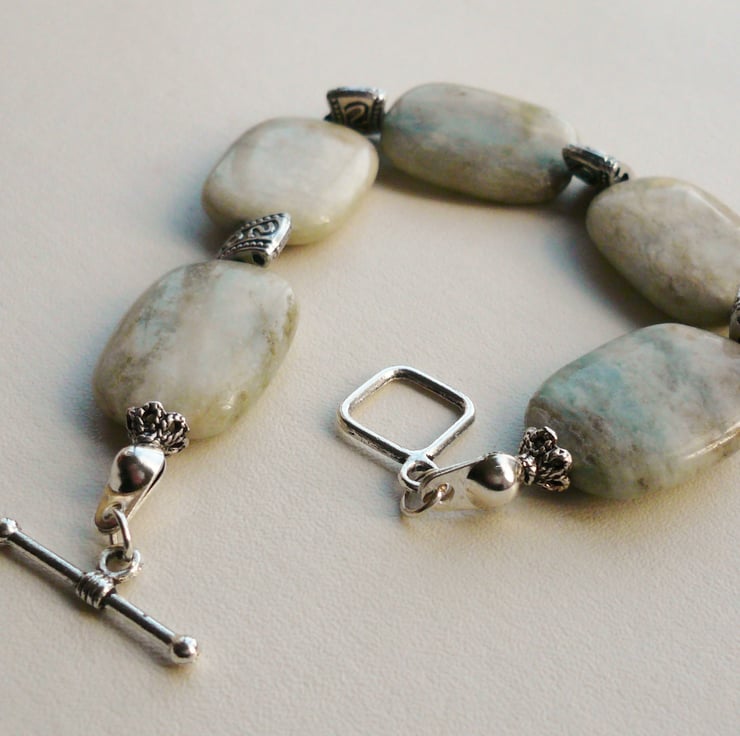 This nice chunky bracelet consists of 25mm x 18mm flat oblong ocean jasper beads alternating with Tibetan silver ornate spacer beads and finished off with a square shaped toggle clasp.