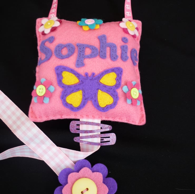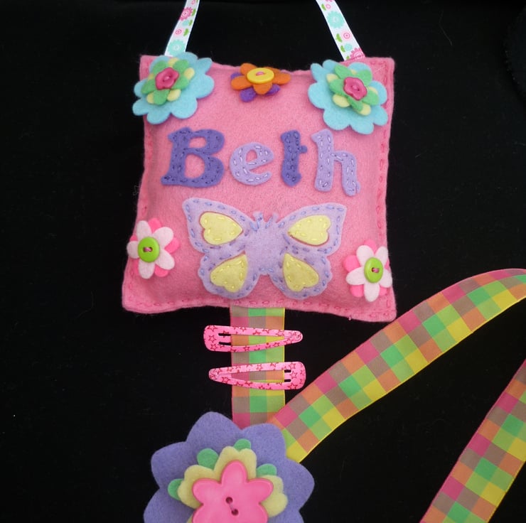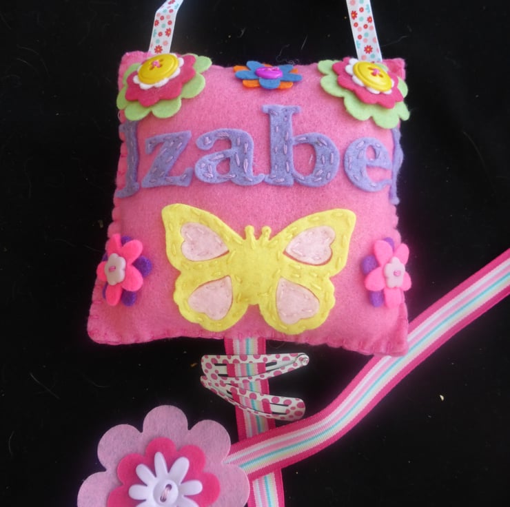 A padded Butterfly and flower hairclip hanger, personalised with a name of your choice. It has a loop on the end of a long ribbon with a poppered felt flower for hair toggles to keep all your girls hair accessories tidy