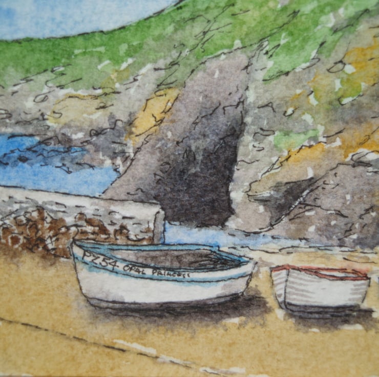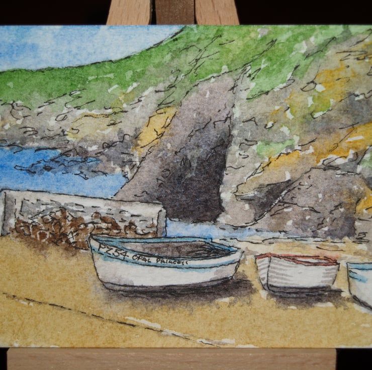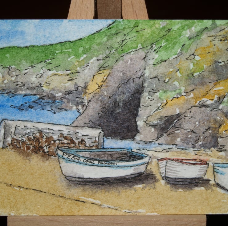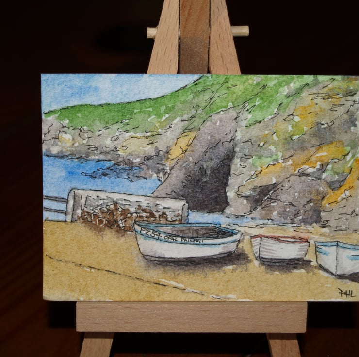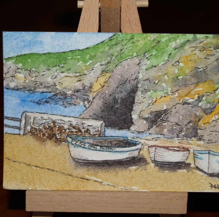This ACEO is an original, handpainted watercolour of boats in Cornwall, with the cliffs behind. It measures 2.5 x 3.5 inches (63 x 89mm). No copies have been made of this, ensuring that it would make a unique addition to any ACEO collection.