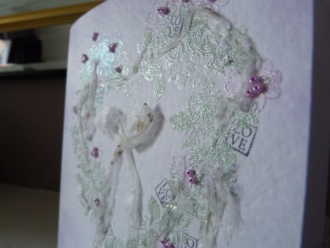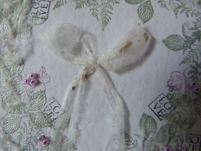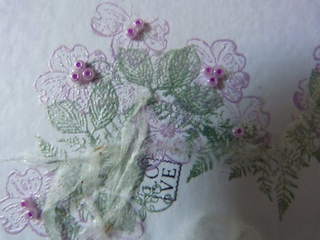 A design of stamped flowers and leaves in heart shape onto quality white hammered card. Heat embossed with fairy glitter and tiny pink glass beads. Further embellished with white handmade silk paper which has also been made into a bow in the centre. Little squares of love stamped in black. Just for you handwritten along the bottom and the edges coloured with pale lilac.