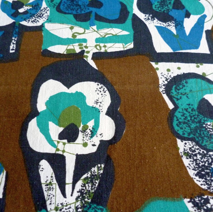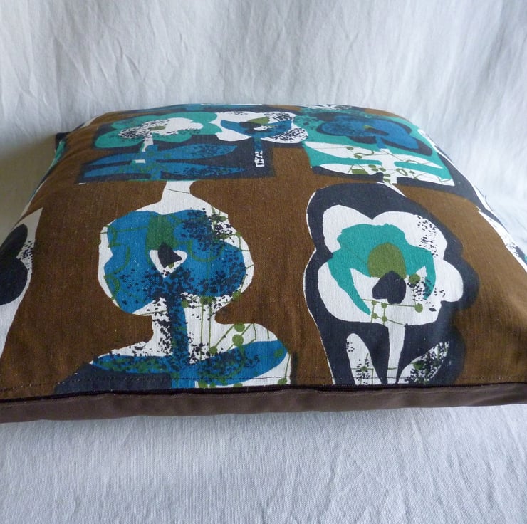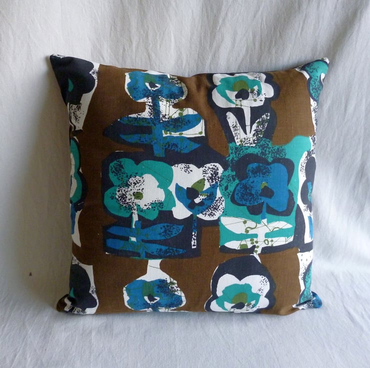 This cushion cover is made from a piece of vintage cotton fabric which has been reclaimed from a curtain. The fabric, which is in excellent reclaimed condition,is in a design called Jessica manufactured by Tibor in the 1960s. The design features rows of pansies in shades of blue and turquoise on a brown background. The back of the cushion cover is made from plain brown cotton twill and the cover fastens with a zip at the bottom. The cover is made to a high standard and all internal seams are overlocked for strength.
