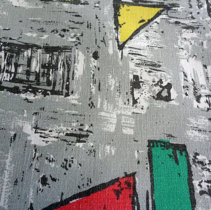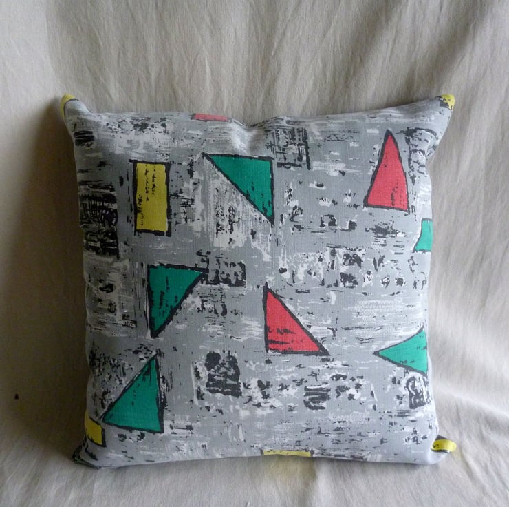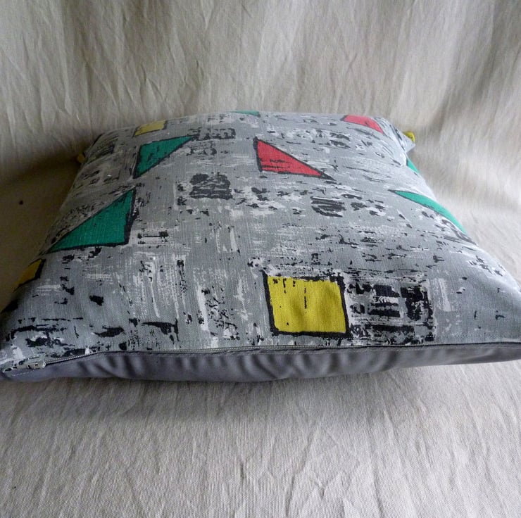 This cushion cover is made from a piece of vintage cotton fabric which has been reclaimed from a curtain. The fabric, which is in very good reclaimed condition, features an iconic design of geometric shapes in red, yellow and green on a grey background and is typical of the atomic designs of the 1950s.. The back of the cushion cover is made from plain grey cotton twill and the cover fastens with a zip at the bottom. The cover is made to a high standard and all internal seams are overlocked for strength.