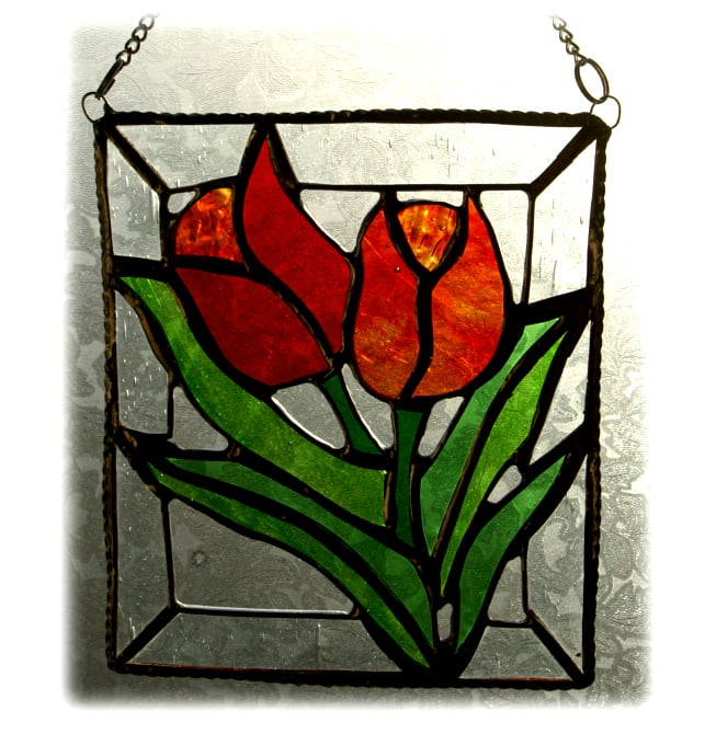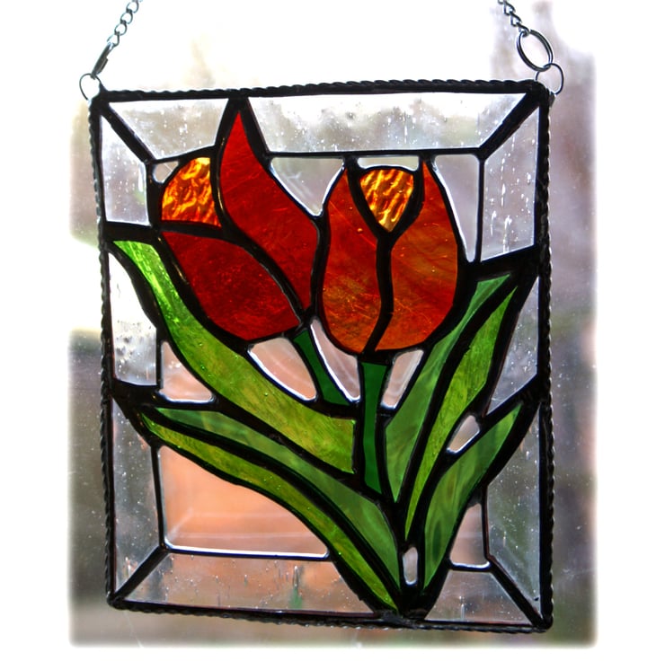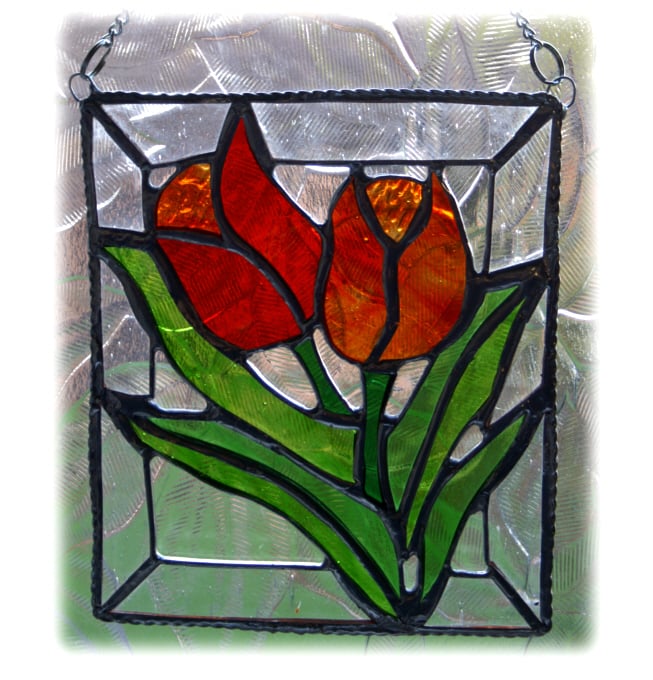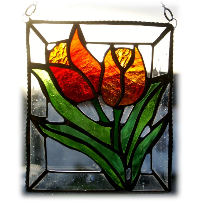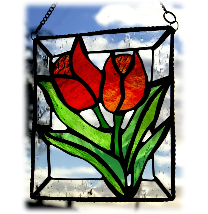 A new design for spring 2014. I've 'painted' a picture in glass of two bright amber red tulips with bright green leaves. I've framed my picture with clear, lightly textured glass leaving the flower set into the frame in places which gives a 3-dimensional illusion.