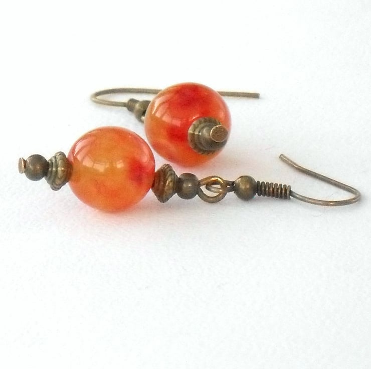 These handmade orange kunzite earrings have been made using bronze wires and smaller beads, that gives them a vintage style.